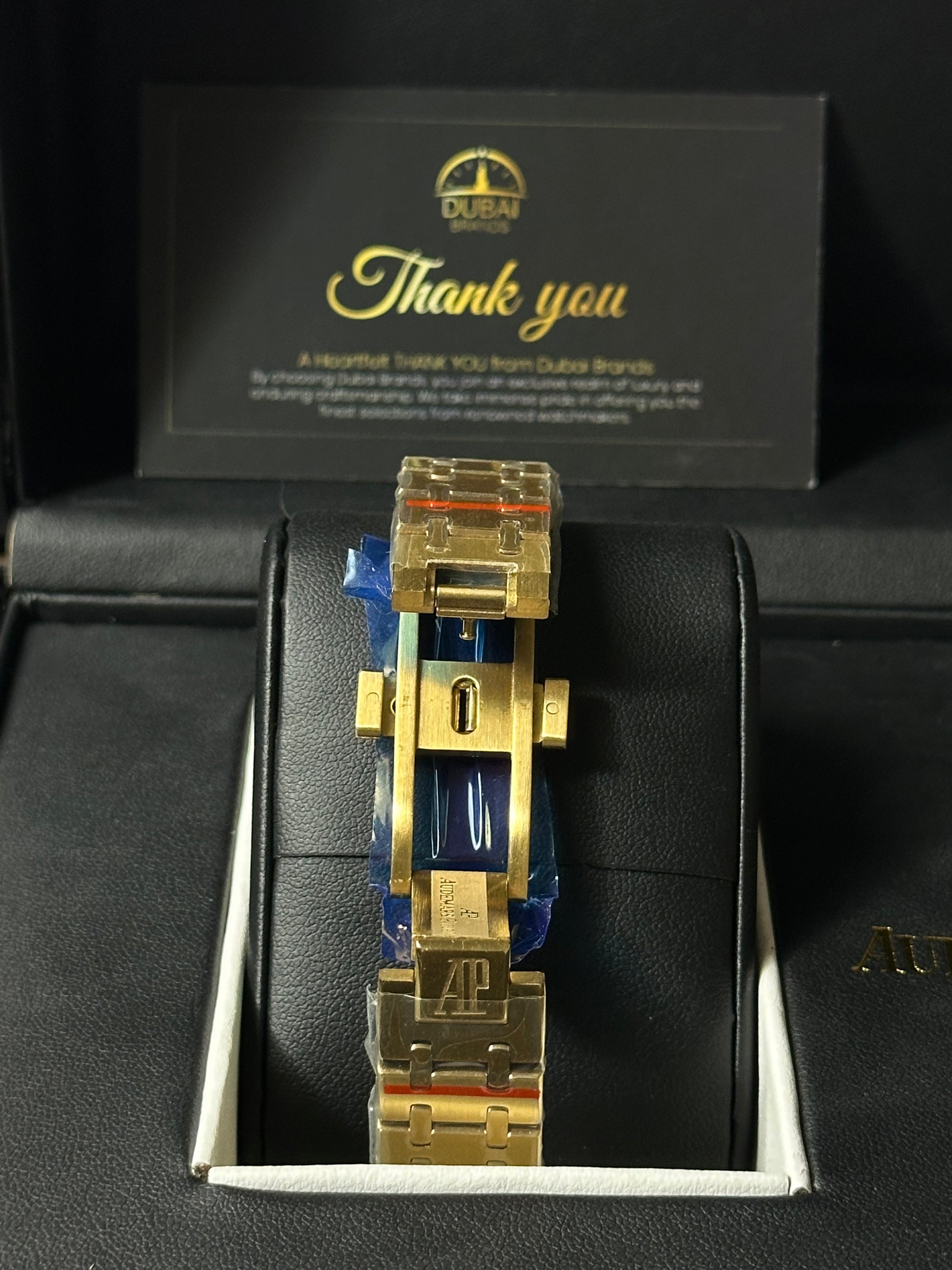 ● Craftsmanship: Accurately replicates the iconic Audemars Piguet Royal Oak design – featuring a brushed gold case, polished edges, and integrated bracelet