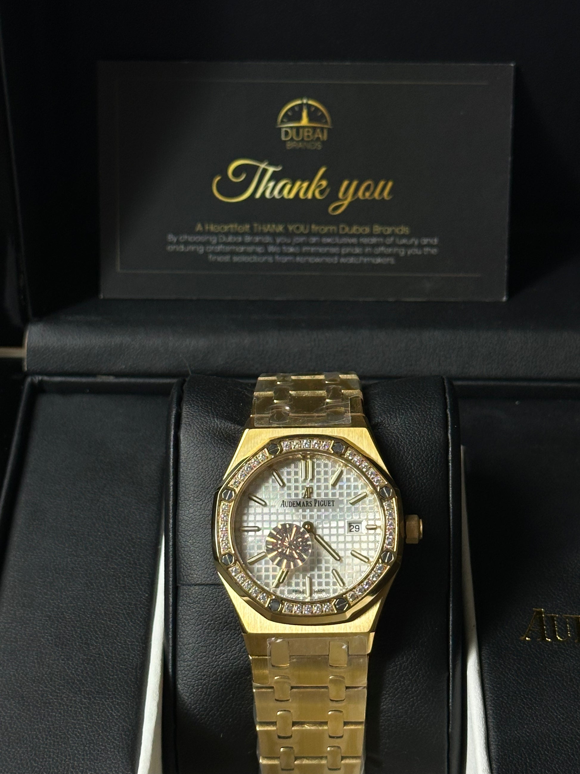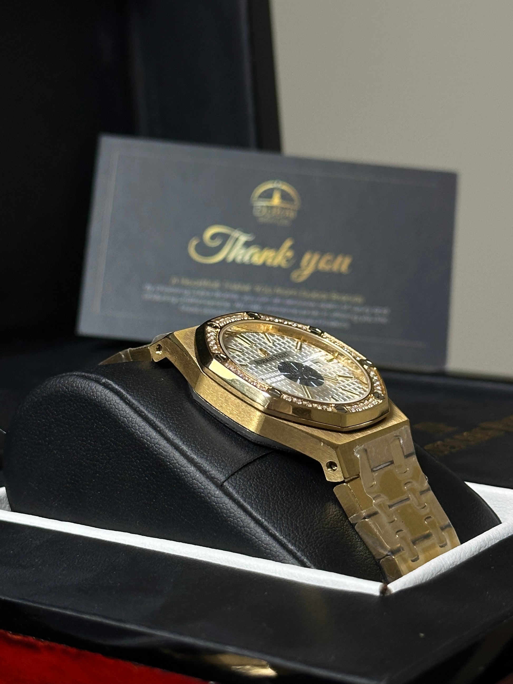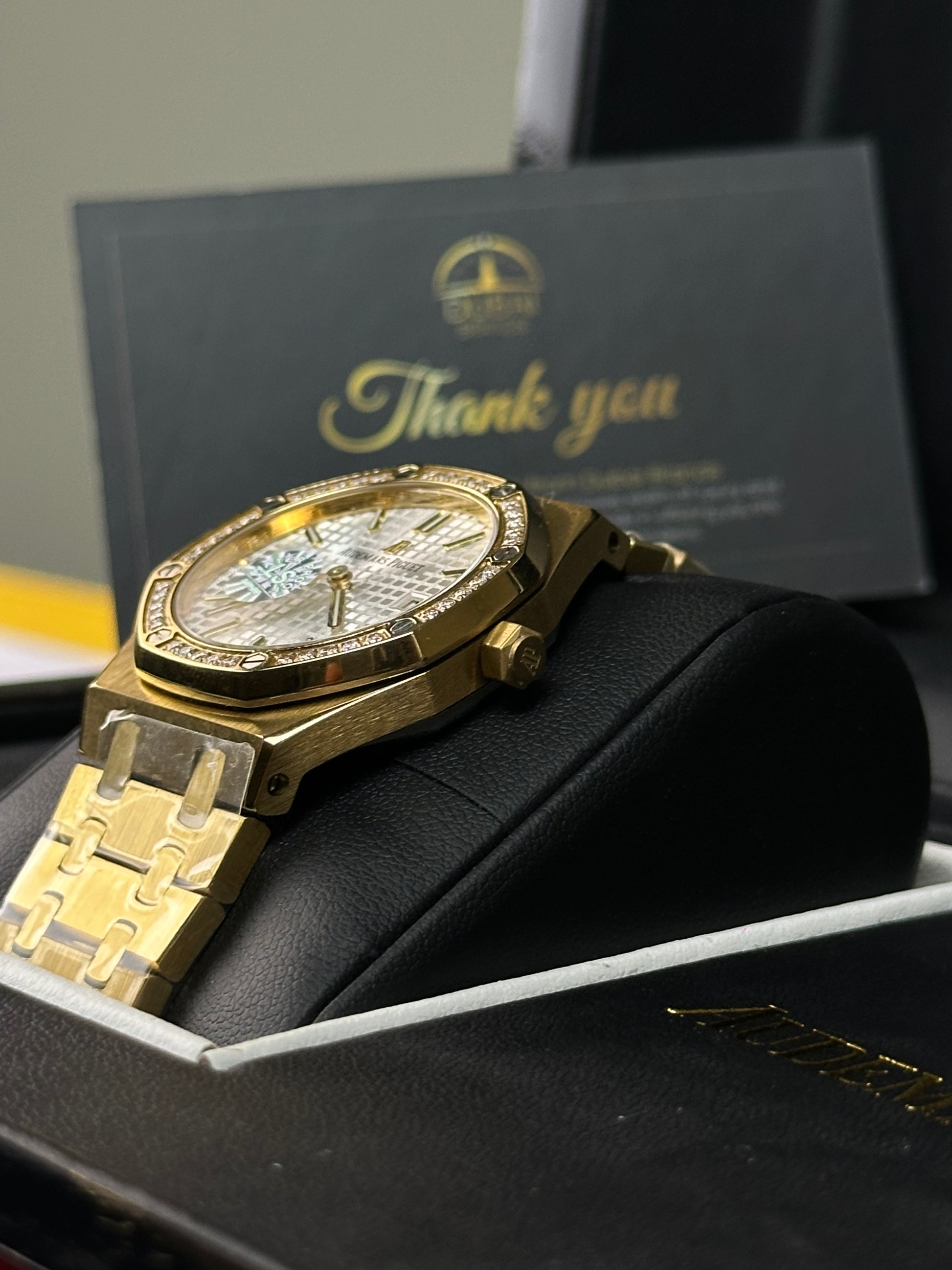 Audemars Piguet Royal Oak – Gold Tone with Diamond Bezel & White Tapisserie Dial