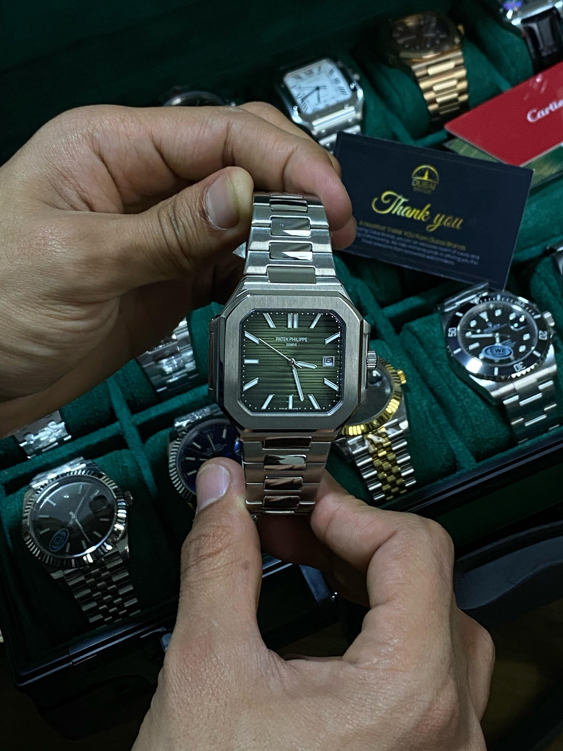 ● Craftsmanship: 1:1 high-quality replica – features Patek Philippe branding, date at 3 o’clock, and a unique rectangular case design