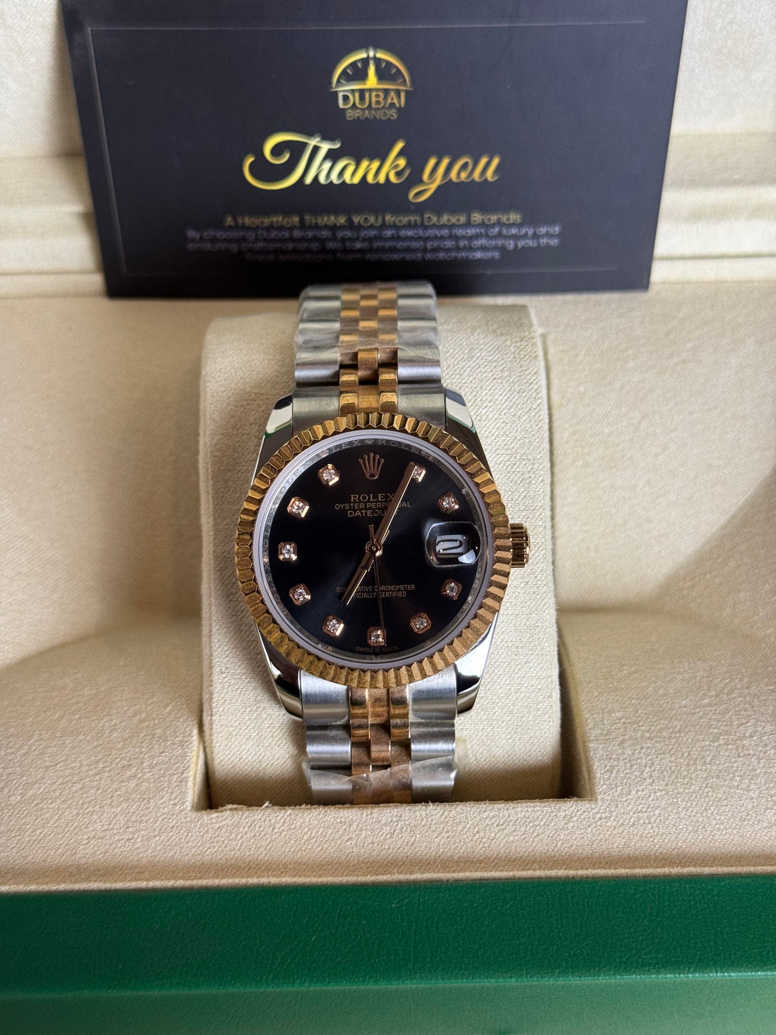 Rolex Datejust 31 Two Tone Black Dial Diamond Markers Fluted Bezel Jubilee Bracelet