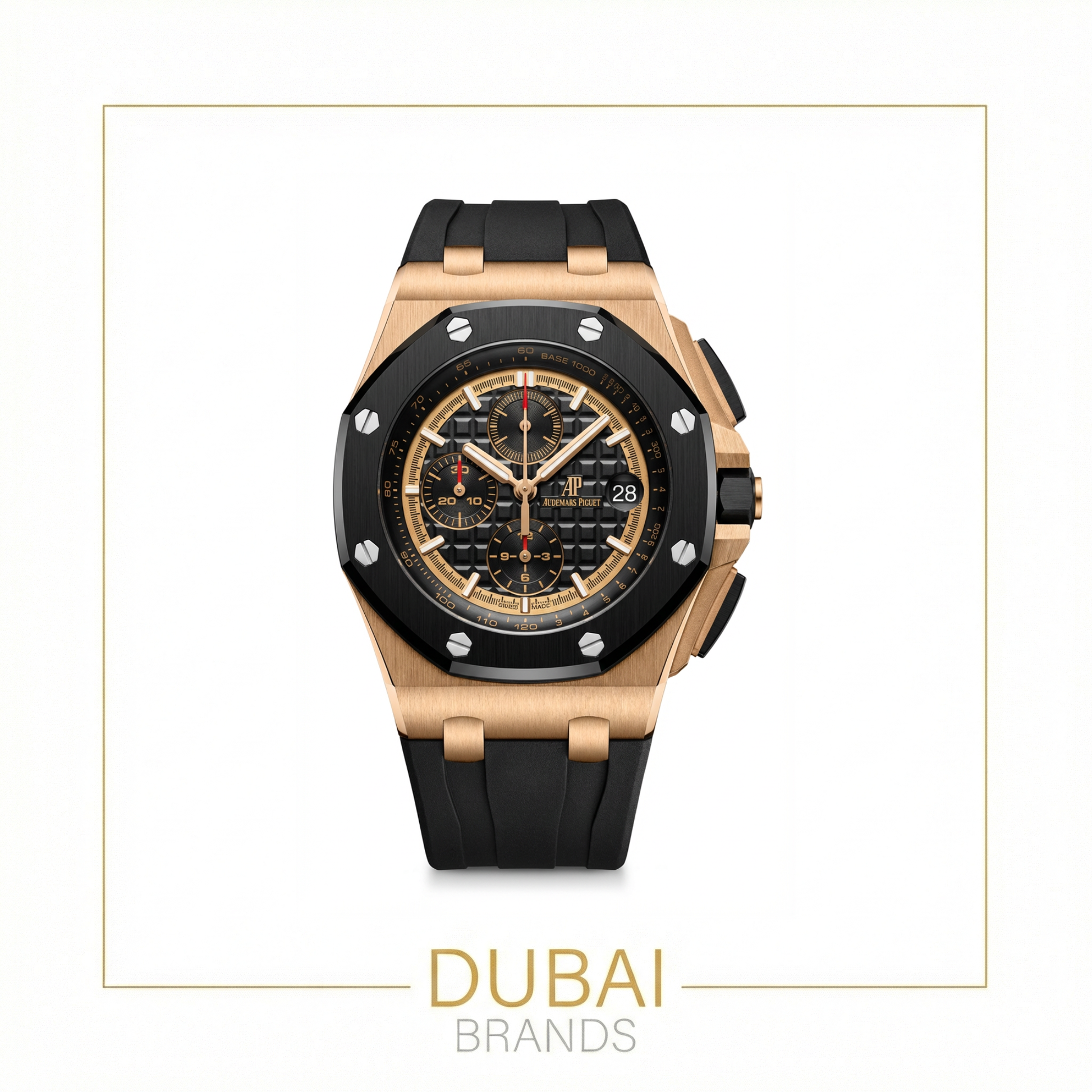 Audemars Piguet Royal Oak Offshore Chronograph 42 Rose Gold Black Dial Gold Subdials Ceramic Bezel Rubber Strap