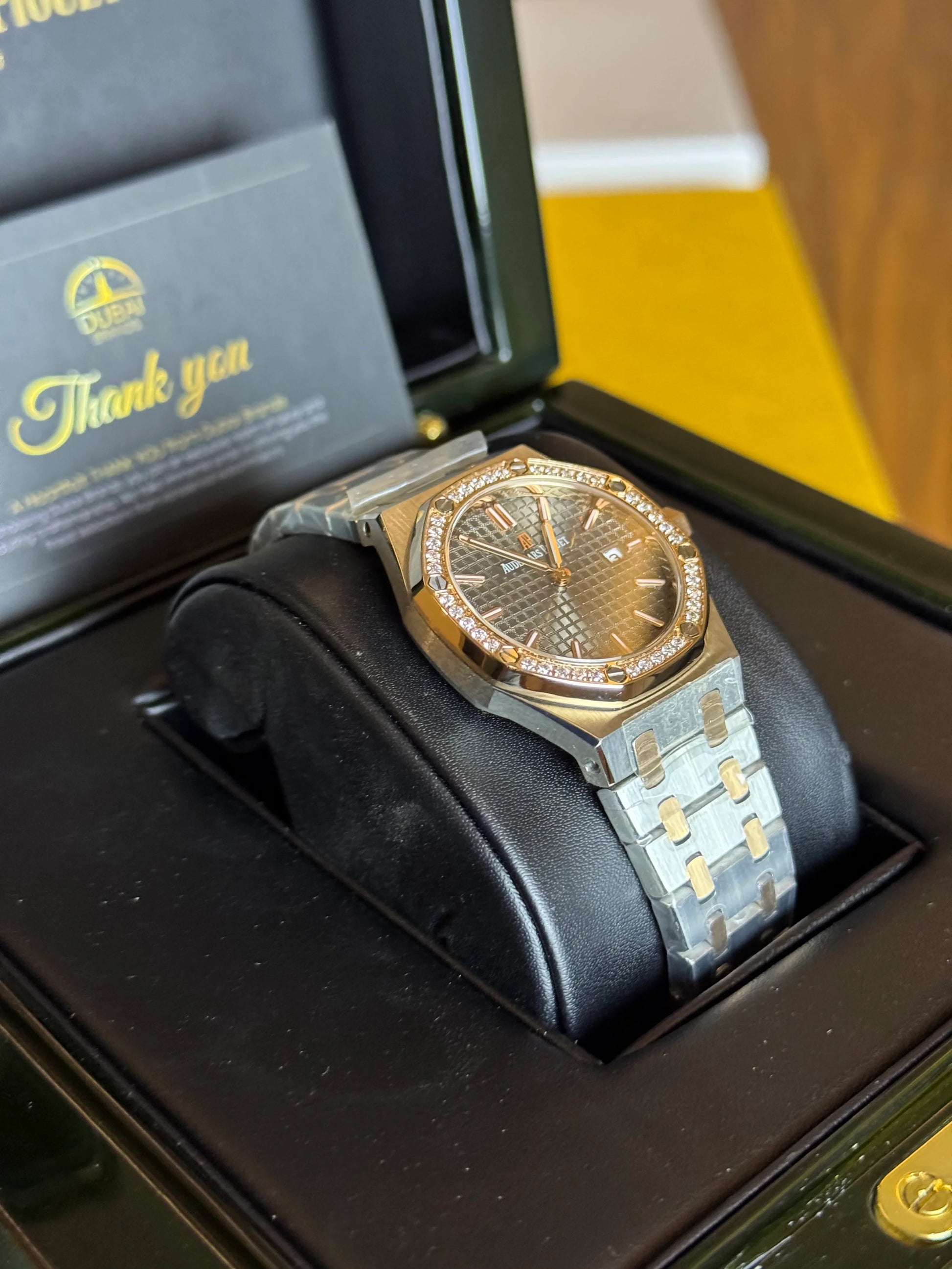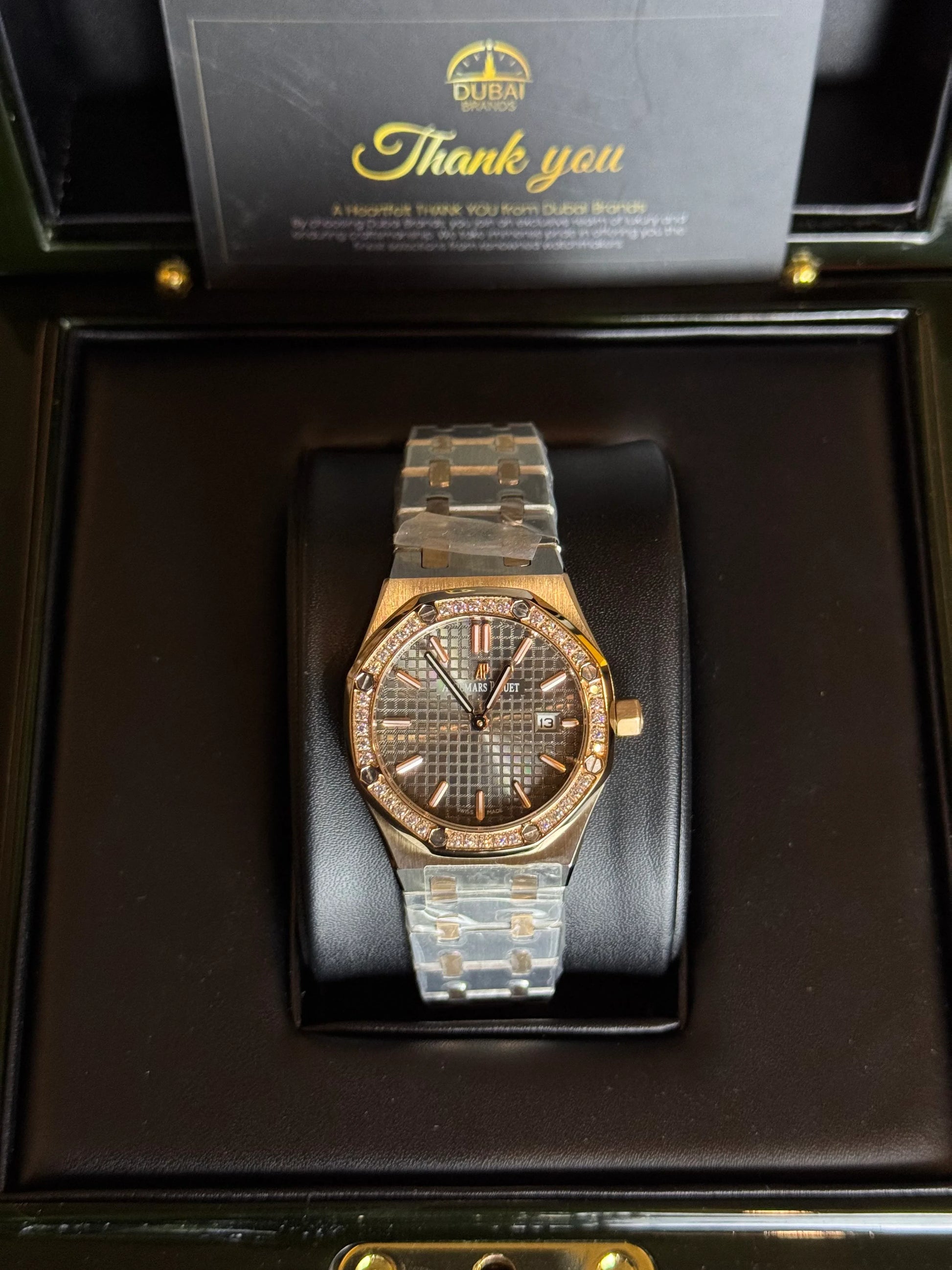 ● Model: Audemars Piguet Royal Oak Style Grey Tapisserie Diamond Bezel Rose Gold Automatic