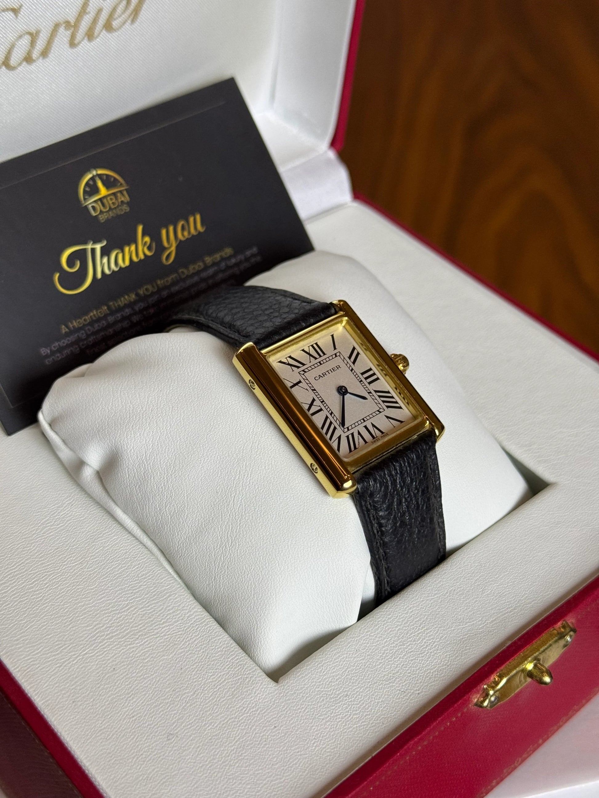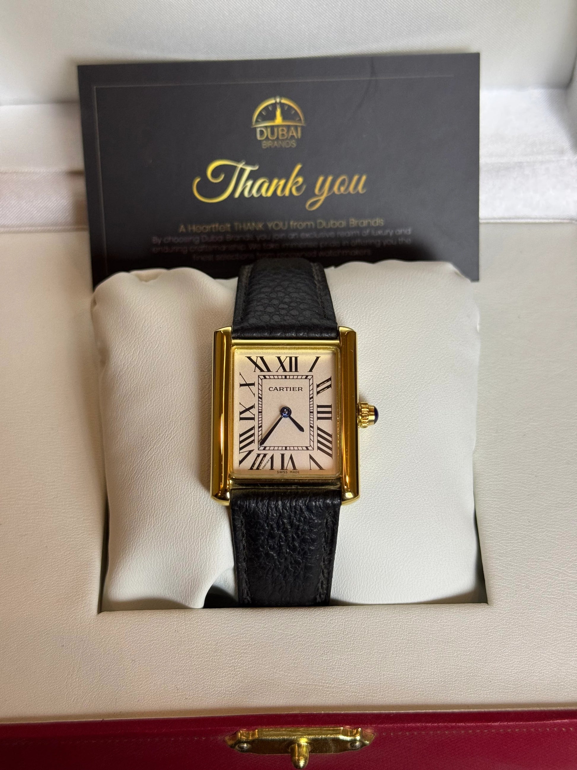 ● Model: Cartier Tank Louis Style Ivory Roman Dial Gold Case Black Leather Quartz