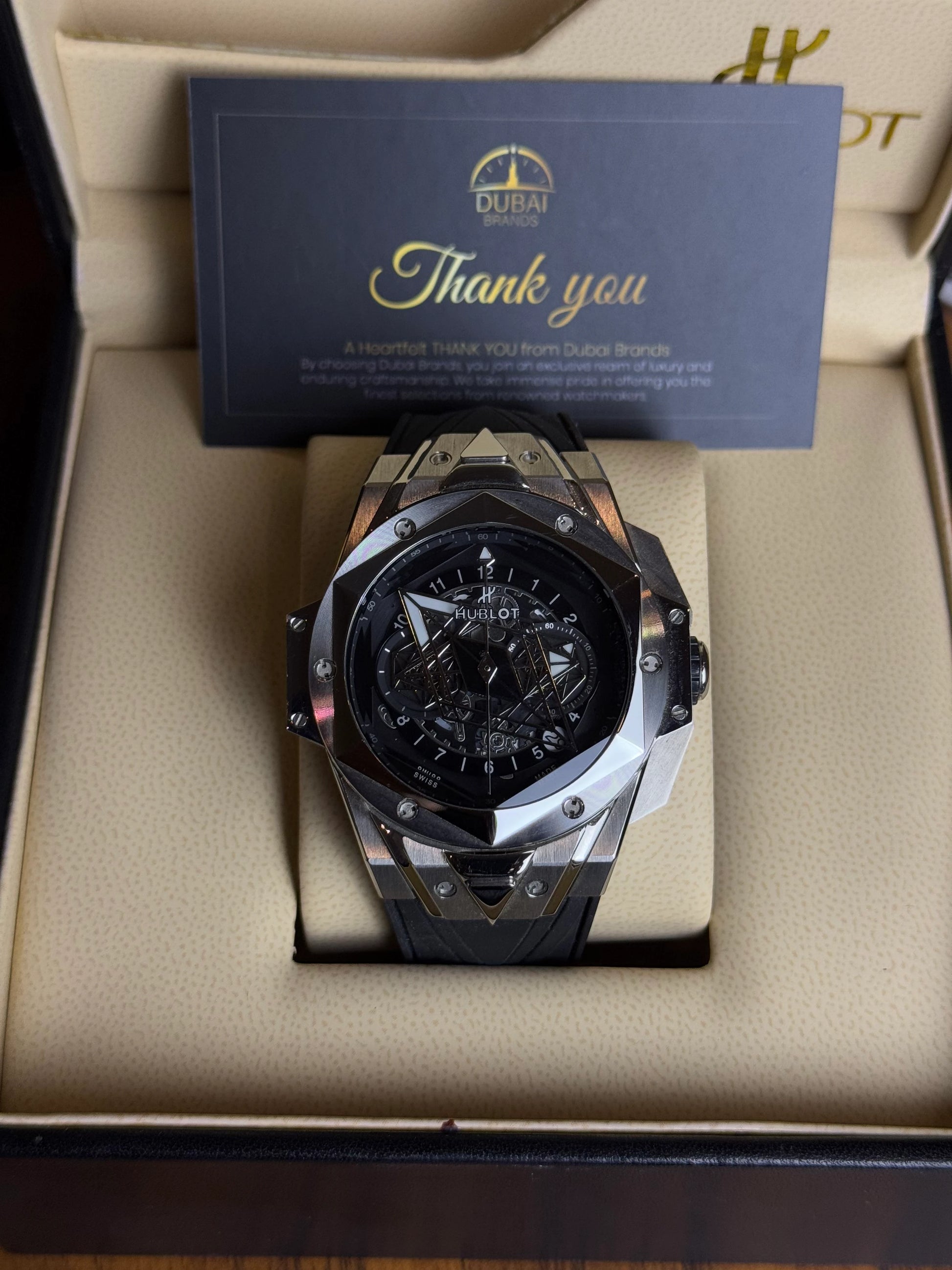 ● Model: Hublot Big Bang Unico Style Skeleton Dial Chronograph Titanium Case Black Rubber Strap