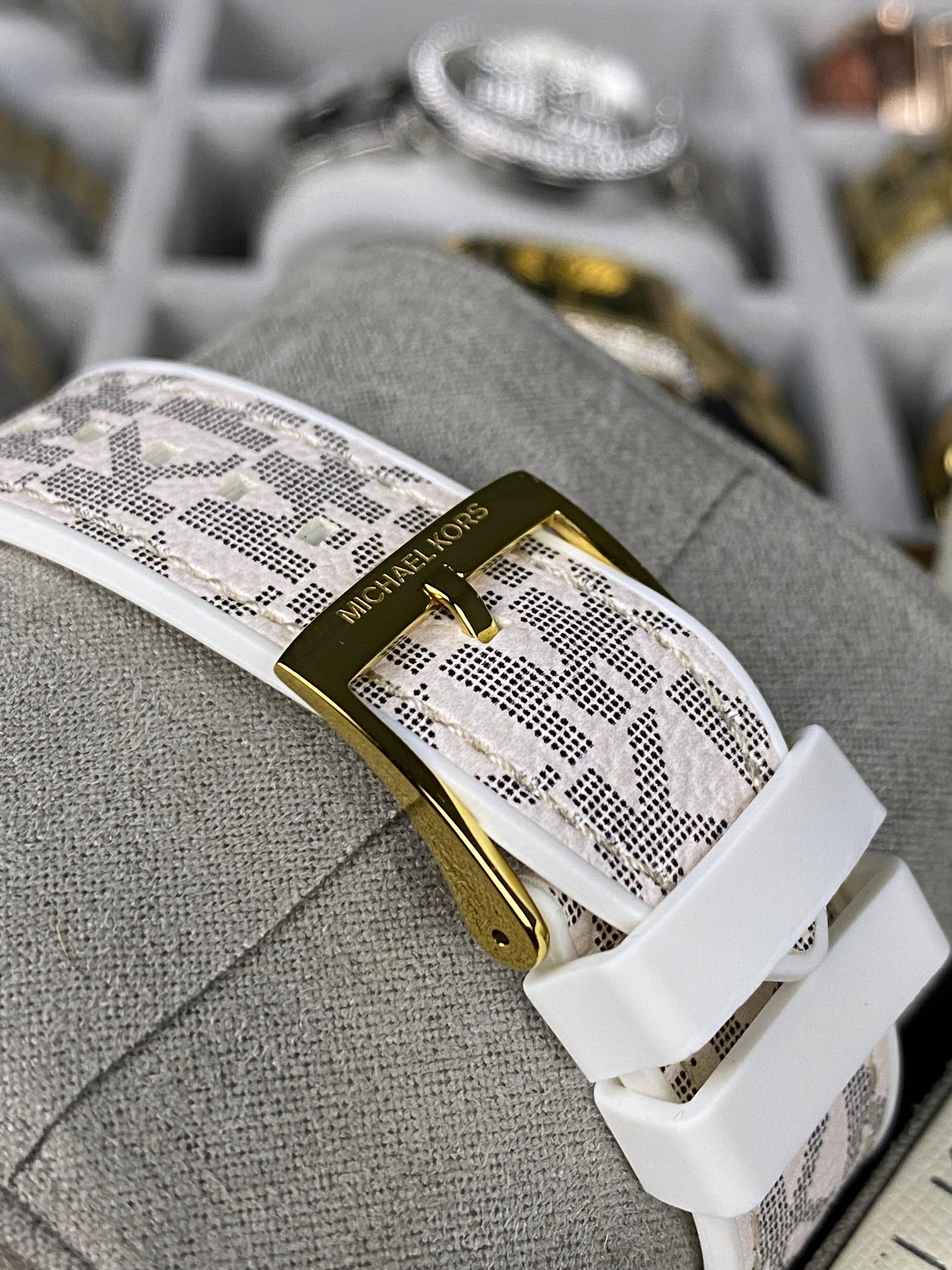 Strap: White leather strap with printed MK logo pattern