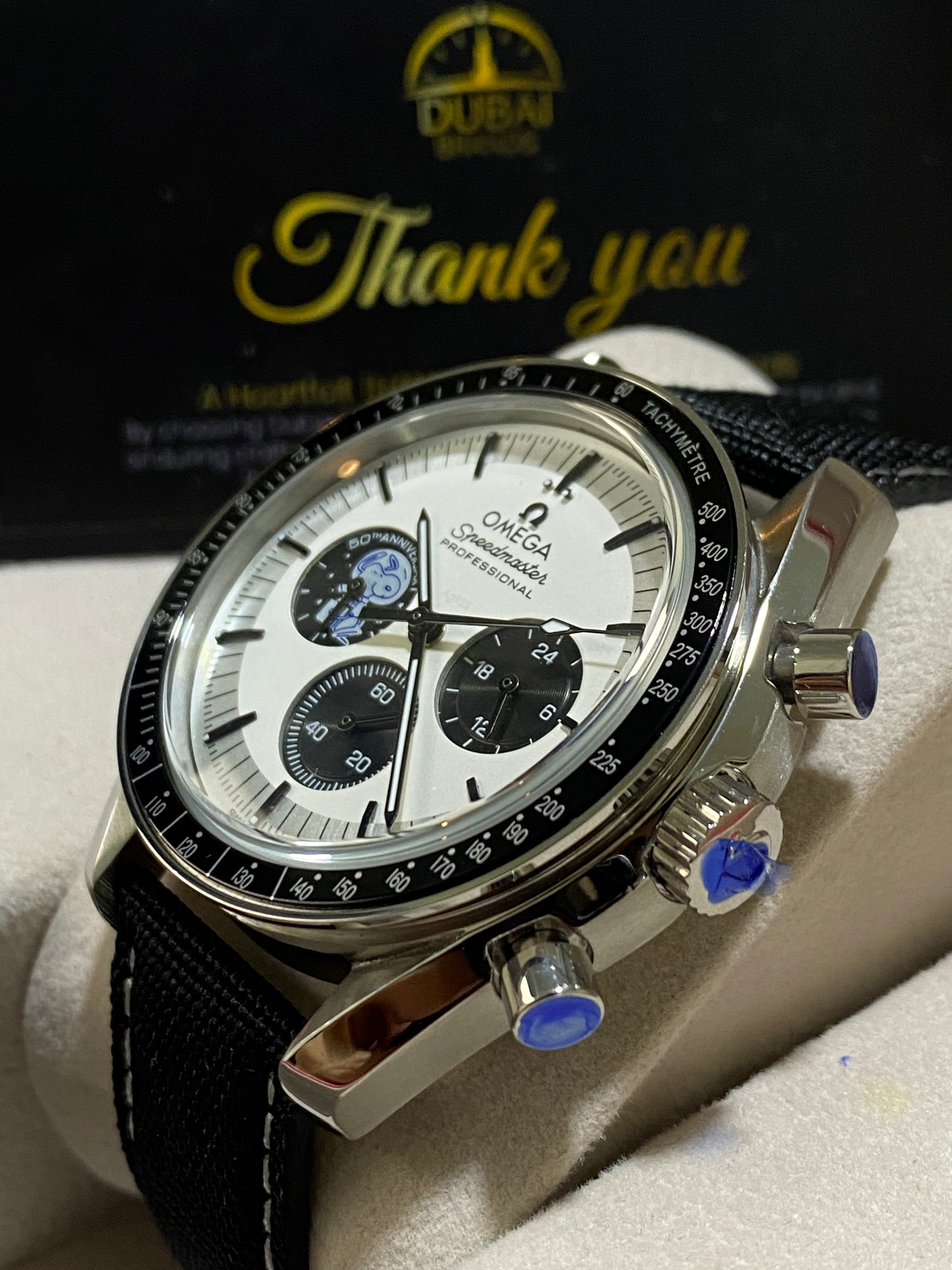 ● Craftsmanship: 1:1 high-quality replica – features official Omega logo, Snoopy anniversary print, detailed chronograph layout, and precise finishing