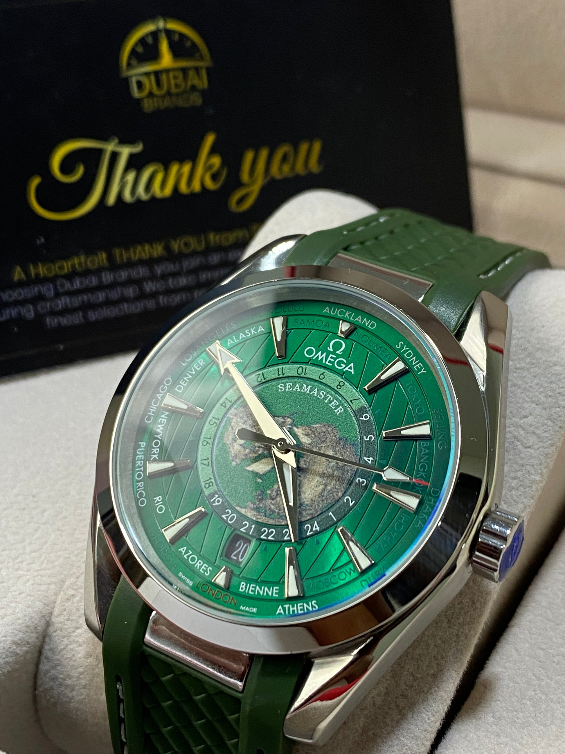 ● Craftsmanship: 1:1 high-quality replica – featuring Omega branding, detailed world map dial, and premium finishing