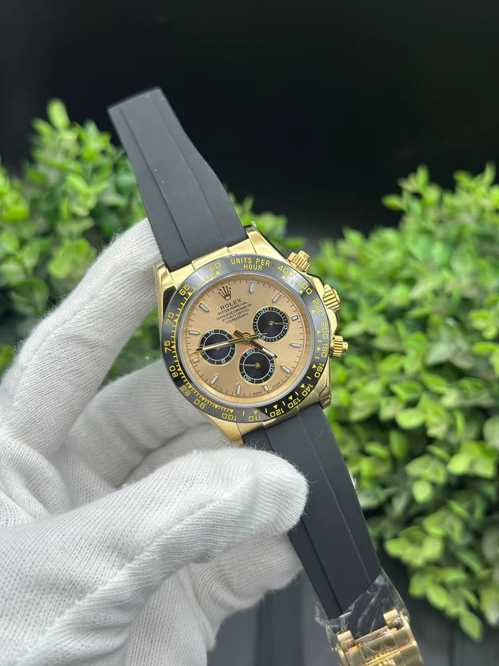 ● Craftsmanship: Bold & royal – Champagne dial with sporty rubber strap – Premium gold-tone elegance with professional finish