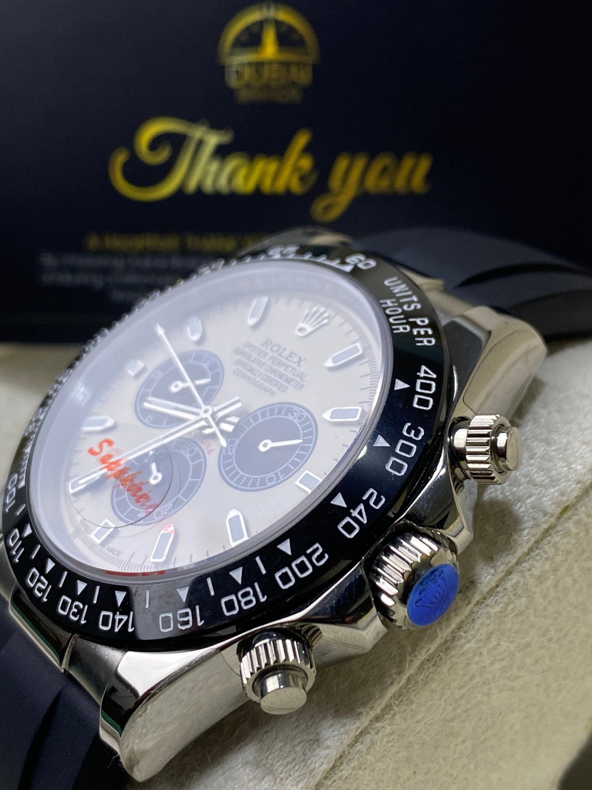 ● Craftsmanship: Clean and bold design – Silver panda-style dial – Premium sport finish with flexible rubber strap