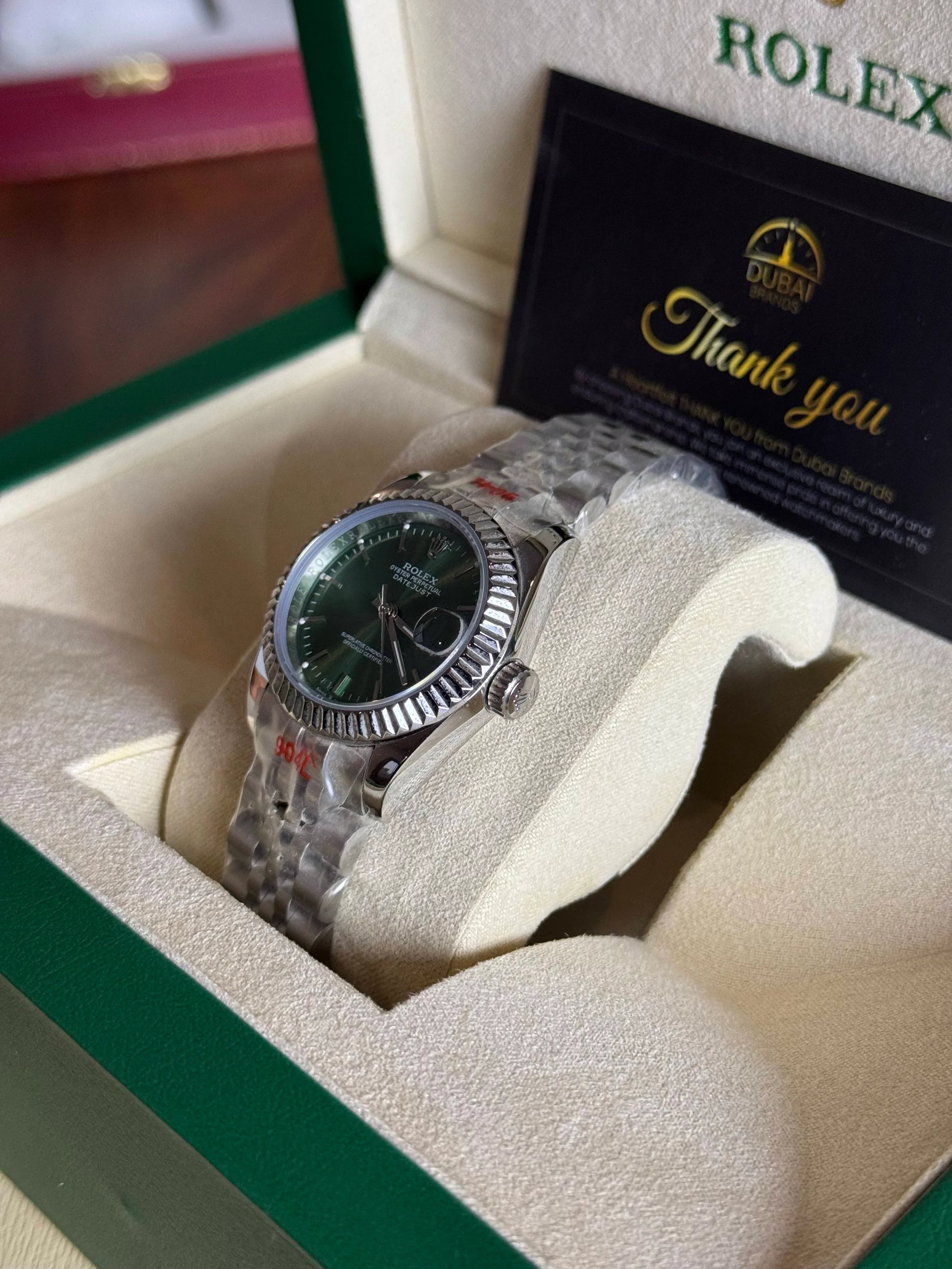 ● Dial: Green sunburst dial with silver hour markers