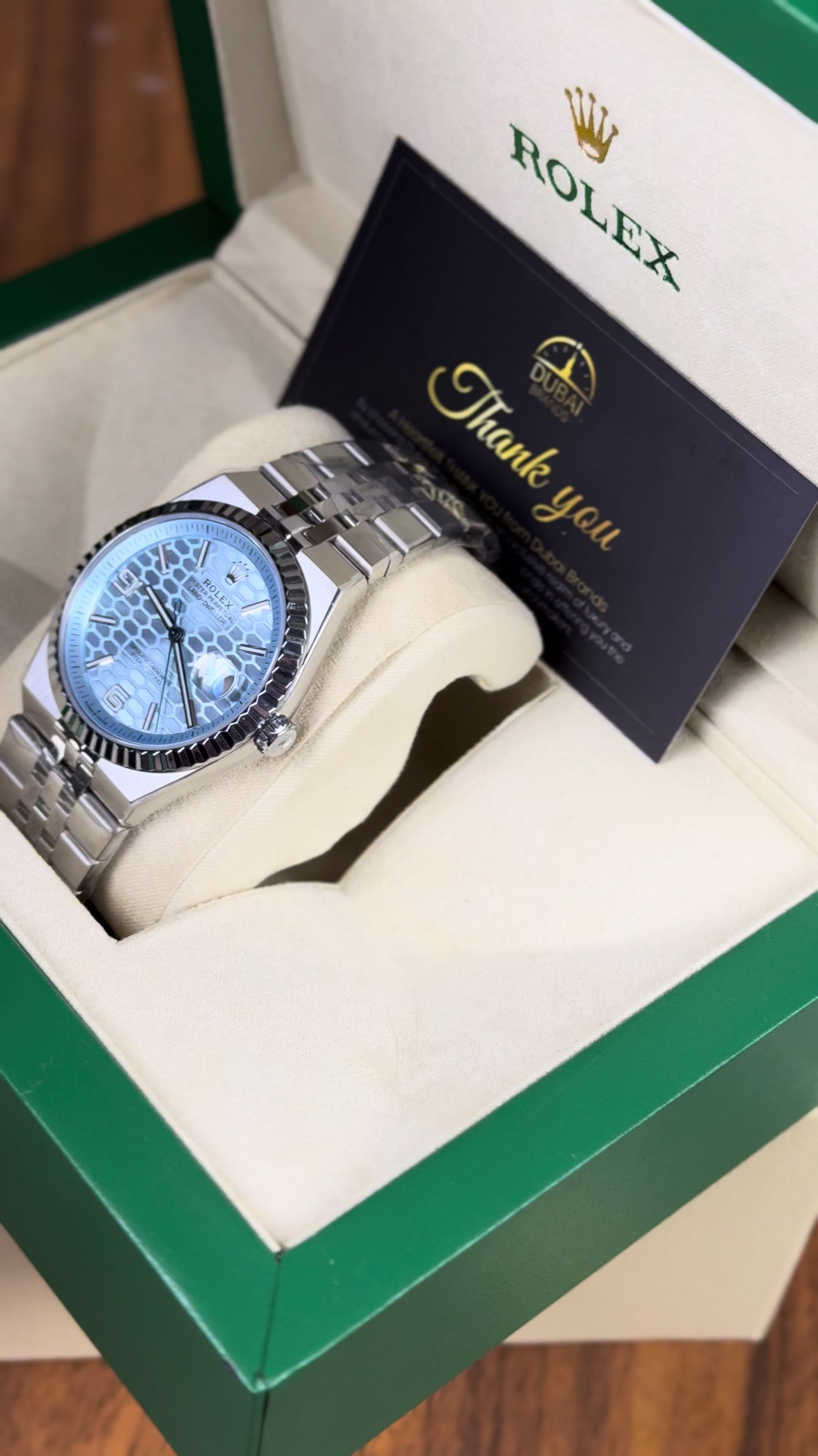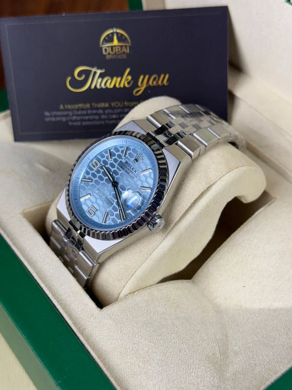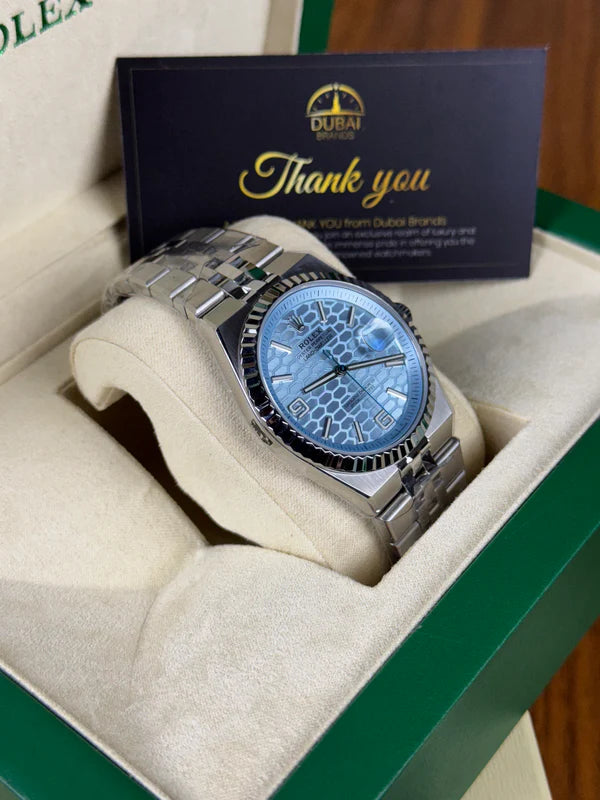 Dial: Ice blue honeycomb-pattern dial with luminous markers
